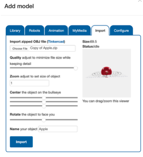 RobotMagic has two distinct ways to import custom 3D models. You can send the model directly from Tinkercad to RobotMagic by utilising our first party integration with Tinkercad, or you can download the 3D model and import it through the web importer.
