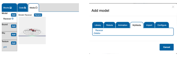 Congratulations, you have now successfully gotten a custom 3D model into RobotMagic. If you want to import your new model into already existing worlds, go to the media tab in the code viewer and click ‘Add Model’ before heading to ‘MyMedia’.