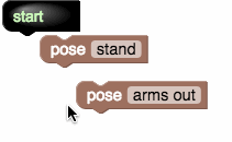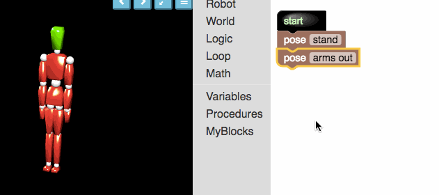 When humans dance, they smoothly transition from one dance pose to another. RobotMagic works the same way. In RobotMagic, a block's behavior can be customized by clicking on the lighter region. Watch how the student customizes a pose using the pose editor and then combines it with the existing blocks for a new movement.