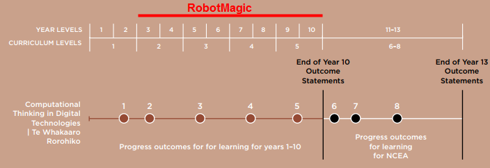 Progress outcomes 2,3,4 and 5, typically taught at year levels 3-10 to kids aged 8-15 are ideally satisfied by a single teaching tool, RobotMagic.