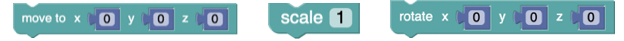 Once you have a 3D object in your world, you can manipulate it in various ways including moving, scaling, and rotating it. The respective blocks are shown below with the JavaScript functions moveTo, scale, and rotateBy. The absolute manipulations are shown above but moving and scaling have relative counterparts. Additionally, scale uniquely allows for per dimension manipulation.